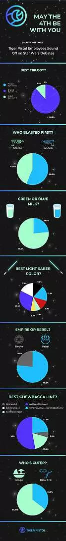 Check out our “May the 4th” infographic, a testament to our love for all things Star Wars. It is a fun peek into the diverse opinions of our Tiger Pistol stars. May the Force be with you as you dive in!