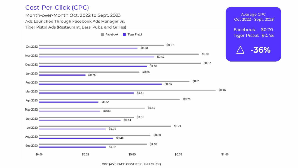 The following charts showcase the average cost of advertising per month for Facebook advertising alongside Tiger Pistol’s performance. They reveal a staggering truth: local ads launched through the Tiger Pistol Collaborative Advertising Platform™ consistently cost significantly less.