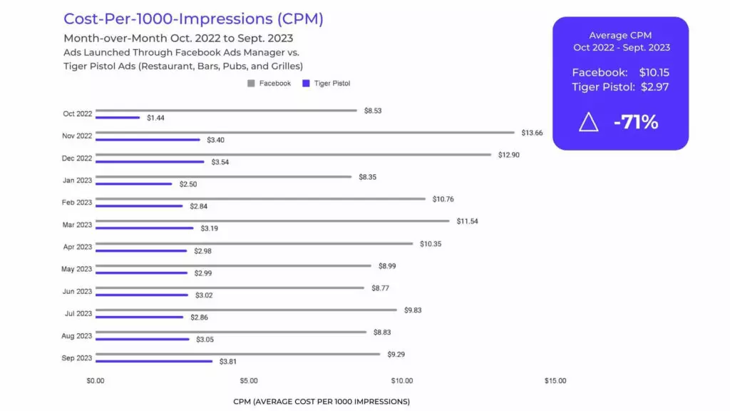 The following charts showcase the average cost of advertising per month for Facebook advertising alongside Tiger Pistol’s performance. They reveal a staggering truth: local ads launched through the Tiger Pistol Collaborative Advertising Platform™ consistently cost significantly less.