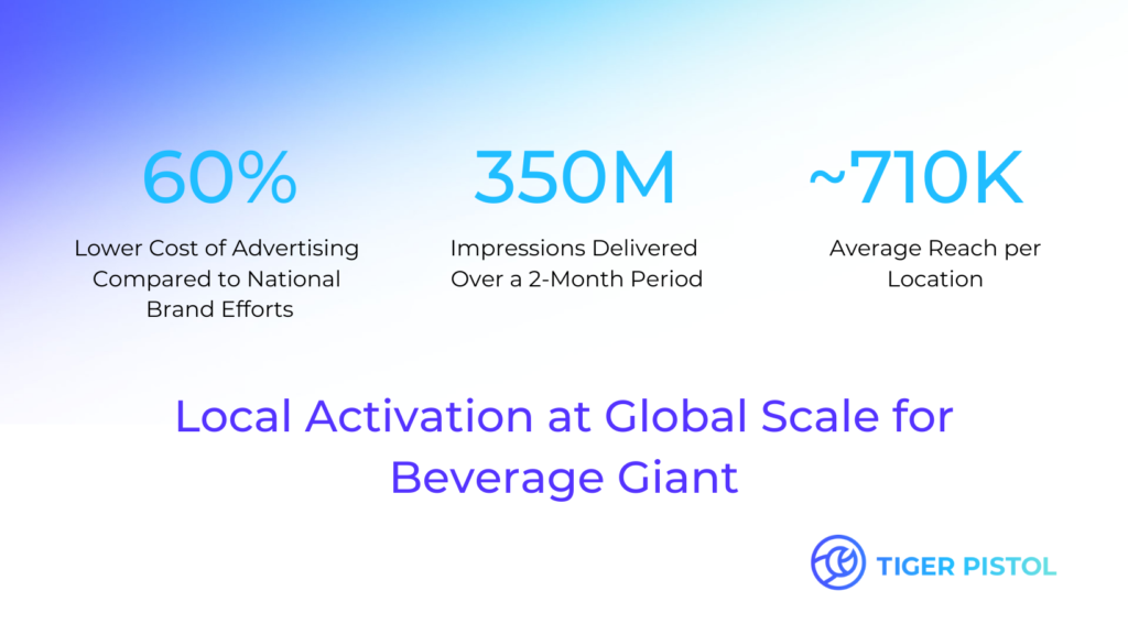 A CPG client used Tiger Pistol for distributing brand-approved campaigns to hundreds of restaurants and bars worldwide. They saw 60% lower CPMs across the local campaigns compared to their national brand efforts. The secret? More relevant ads. Comparing the national effort, which targeted the same consumer base, vs. the local campaigns, the differences are night and day. The distributed framework of the local campaigns meant the client had more exacting control in only geo-targeting the sales areas where consumers could get to the point of purchase. Additionally, unlike the national campaign, having local campaigns in-market meant that the creative could be region- or even hyper-specific.