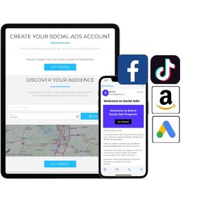 Sales team signs up customer and collects campaign plan details. Customer connects or creates Facebook Business Page, TikTok account, Amazon Ads account, and Google Ads account.