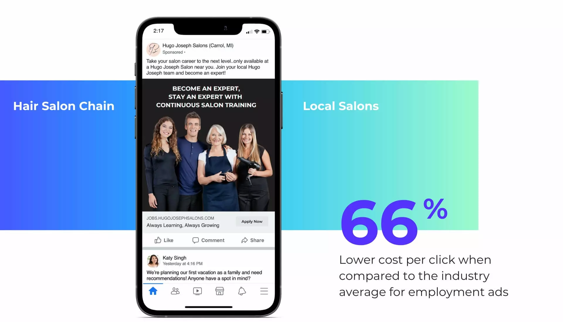 An American Hair Salon Franchise partnered with Tiger Pistol to equip their franchisees with a self-serve social ad solution that enabled the franchisee to launch an on-brand recruitment ad in less than 5 minutes. The brand realized a 56% increase in CTR and a 66% lower cost per click when compared to the industry average for employment ads.