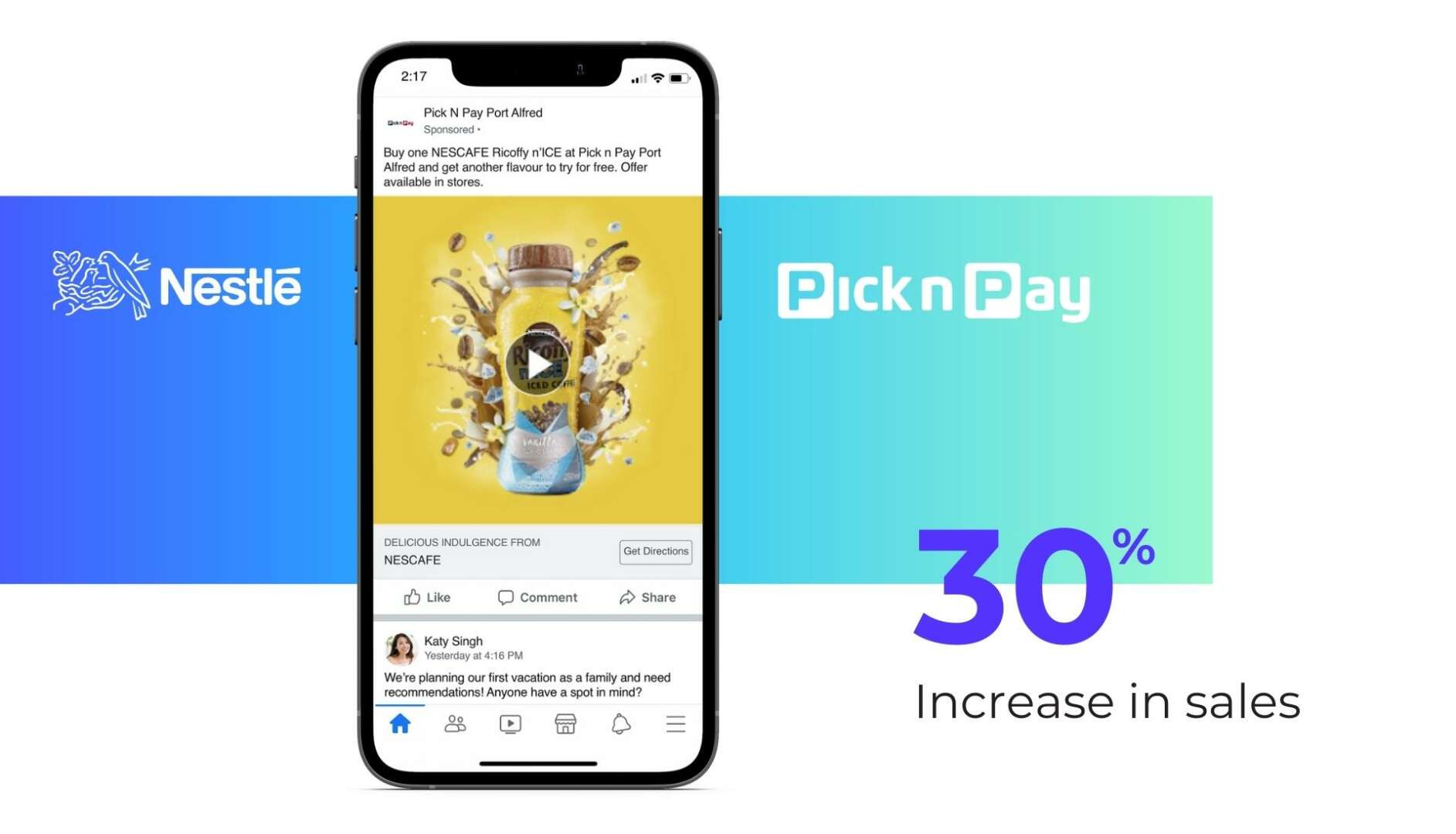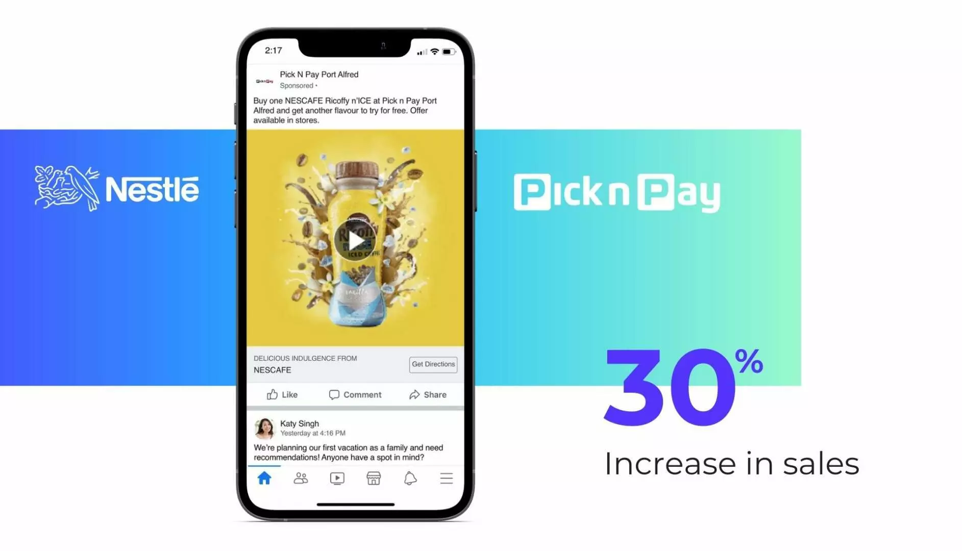 Nestlè sought to increase reach and drive foot traffic for Nestlè Ricoffy n’ICE at Pick N Pay stores in the Eastern Cape region of South Africa. Ads were published from individual Pick N Pay Facebook Pages to generate demand reliably and efficiently at a store level. The platform tracked sales lift for each store ensuring the ROI tied directly to revenue.