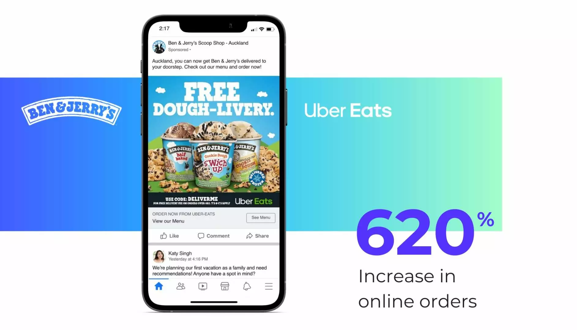 International ice cream franchise, Ben and Jerry’s, needed a way to promote and increase online delivery orders from their Scoop Shops via Uber-Eats. The franchise launched collaborative ads at scale using Tiger Pistol’s platform to geo-target ads for Uber-Eats’ delivery area. The ads utilized the call-to-action,“Order Now via Uber-Eats” to bring users to Uber-Eats’ online ordering page for their local Scoop Shop. Participating Scoop Shops saw a 620% increase in online orders.