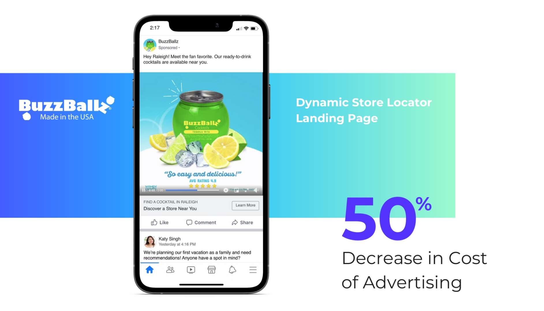 BuzzBallz sought to create hyper-local advertising campaigns that would comply with U.S. 3-Tier alcohol advertising regulations while simultaneously driving shoppers to local retail partners. BuzzBallz deployed proximity-targeted Facebook campaigns through Tiger Pistol’s platform that directed consumers to a store locator page that dynamically localized to show all nearby retailers where BuzzBallz products could be purchased. This enabled the beverage brand to promote their signature party drink securely as well as drive sales for themselves and for their network of restaurants, bars, grocers, gas stations, or convenience stores.