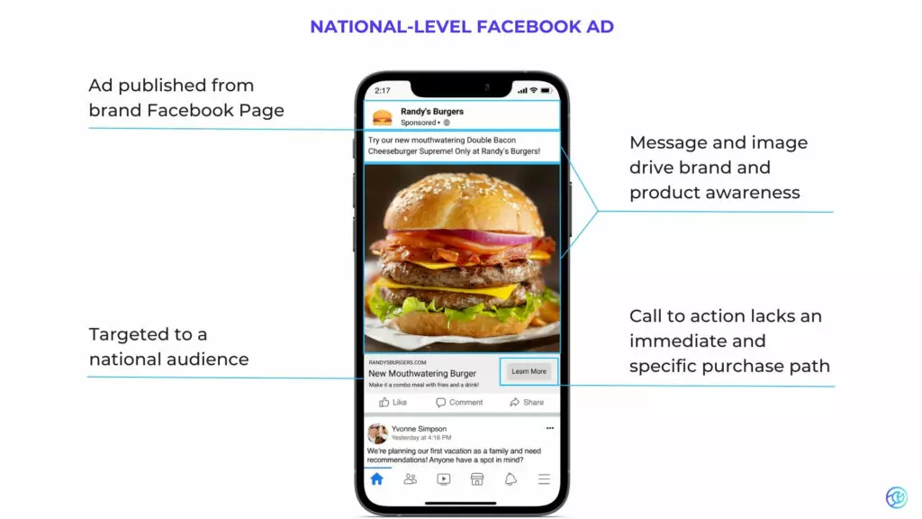 Relevancy involves targeting the ad to the right audience based on their interests, demographics, and behaviors. Many brands run national ads to geo-targeted or DMA audiences, erroneously believing it achieves locality. However, even at these targeting levels, the call-to-action remains unspecific, and messaging revolves around driving brand awareness, not helping the audience take the next step of their journey to purchase.