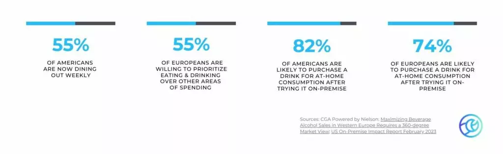 As the world emerges from the pandemic, people are eager to make up for lost time. This has led to a surge in on-premise dining, making local establishments like bars and restaurants more critical than ever for building brand loyalty and driving sales. Supporting your trade partners has become increasingly urgent as beverage industry competition intensifies. Curren Goodden Associates (CGA) powered by NielsenIQ reports that in key United States markets, 55% of people surveyed are now dining out weekly, which is only two percentage points lower than pre-COVID-19 levels. The on-premise market in Europe is also recovering, with Western Europeans willing to prioritize eating and drinking out over other areas of spending.